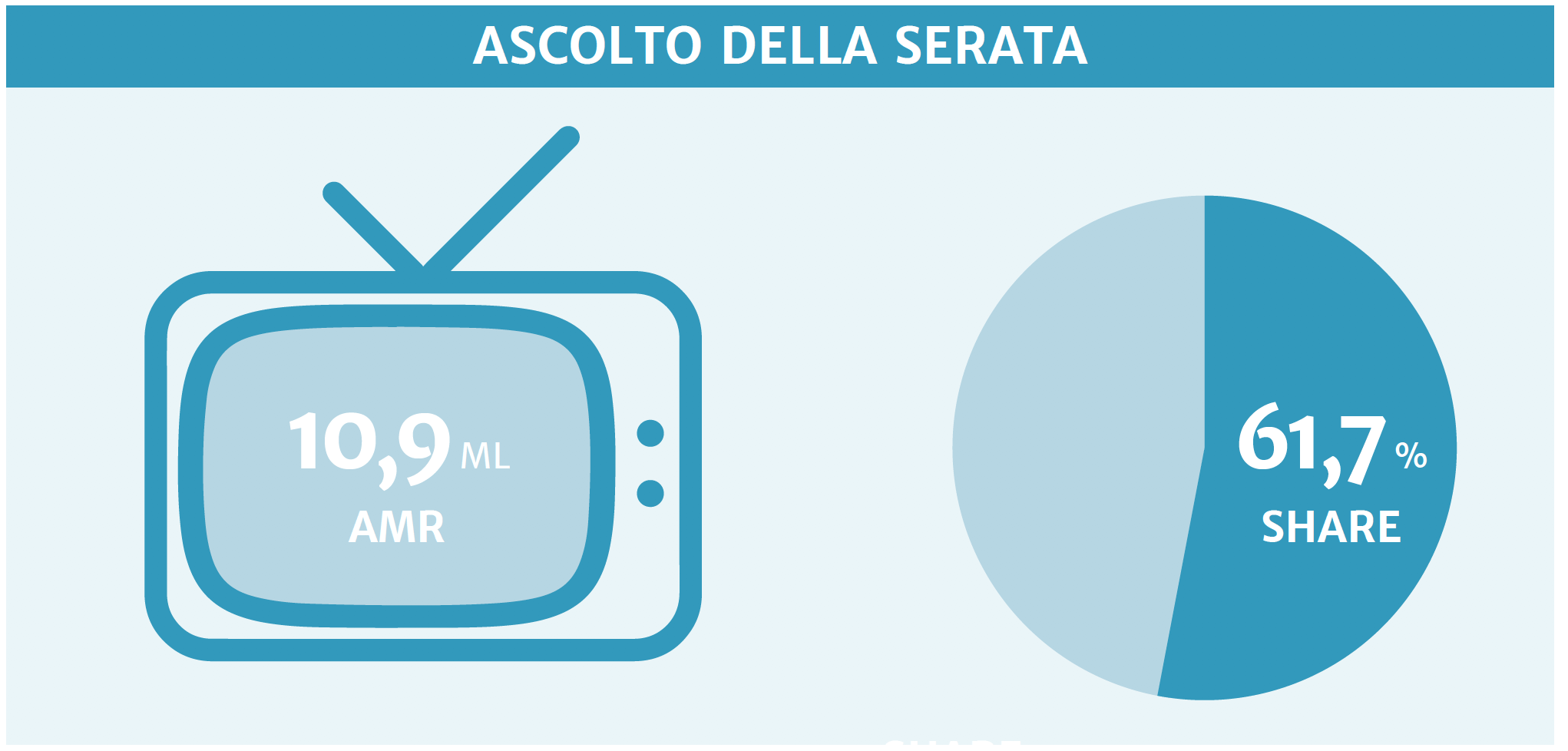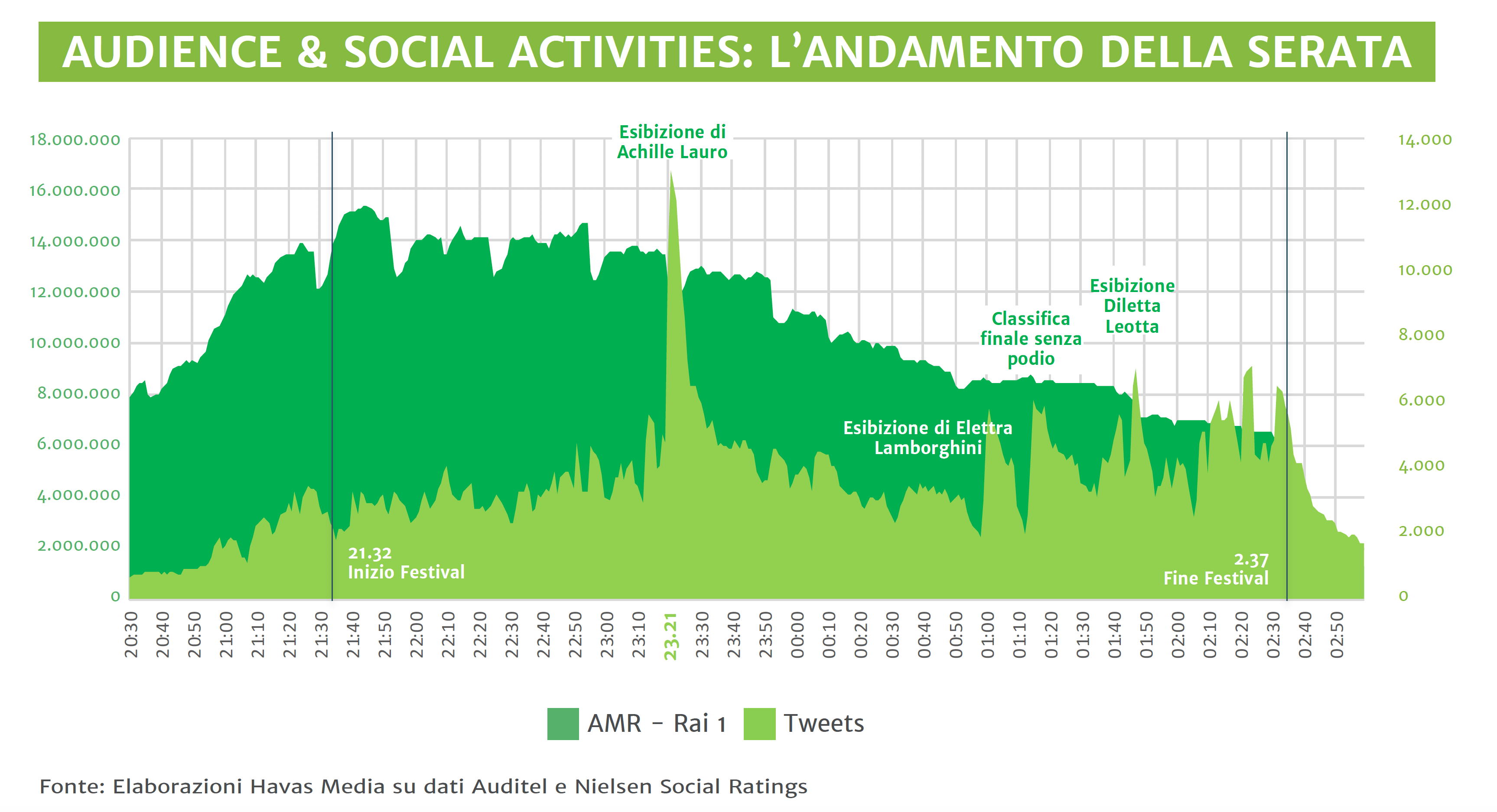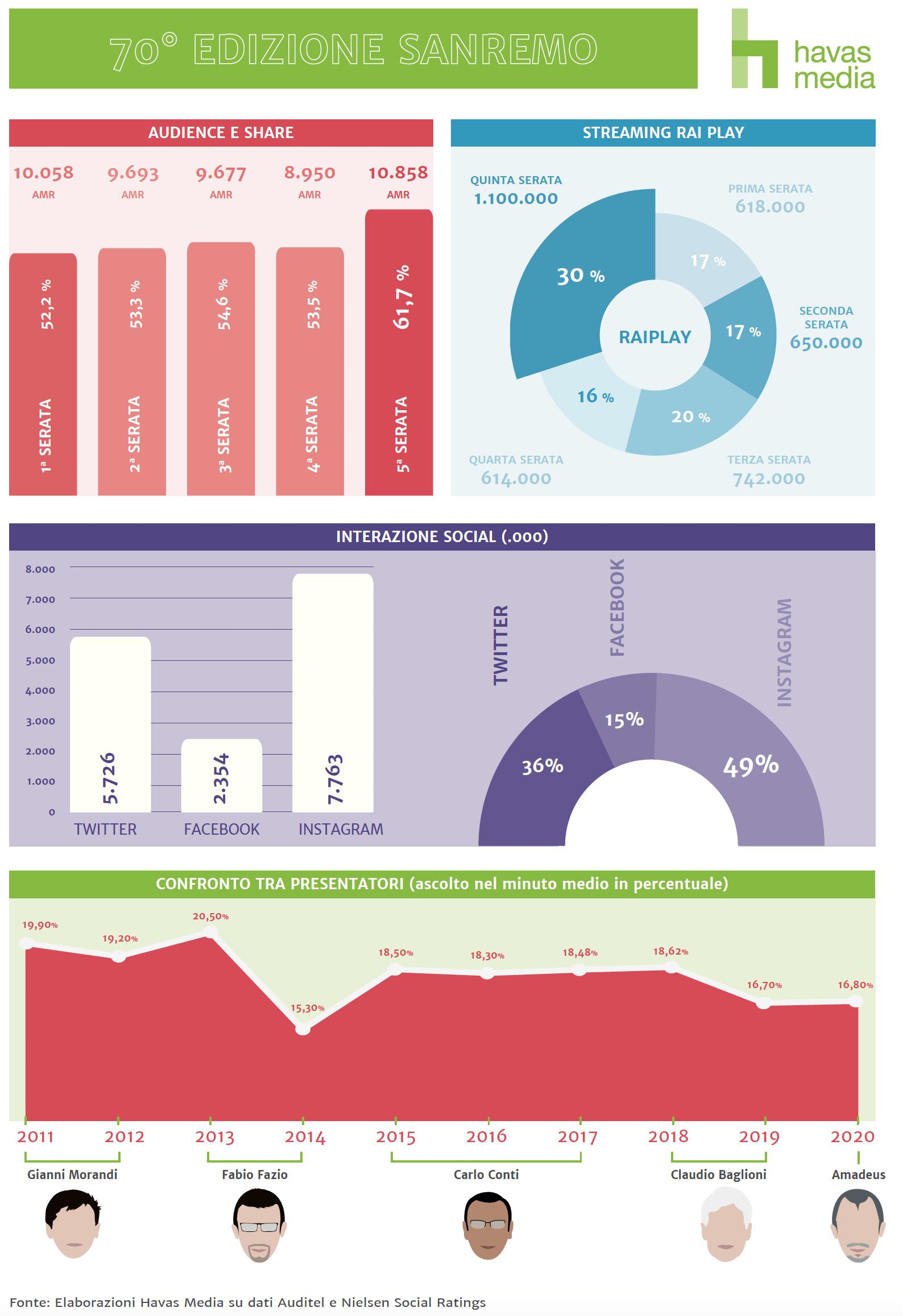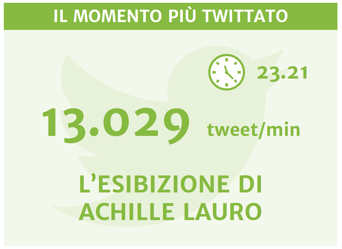Si spengono le luci sul palco del Teatro Ariston, e l’ormai concluso 70esimo Festival di Sanremo targato Amadeus riesce a raggiungere nella serata finale della kermesse 10.858.000 spettatori nel minuto medio (+2,2% rispetto alla finale dell’anno scorso) e una share del 61,7% (5.2 punti di incremento rispetto alla serata conclusiva del 2019). Il picco di engagement sui social è stato raggiunto nuovamente dall’esibizione di Achille Lauro, che ha scatenato 13.029 interazioni al minuto su Twitter.