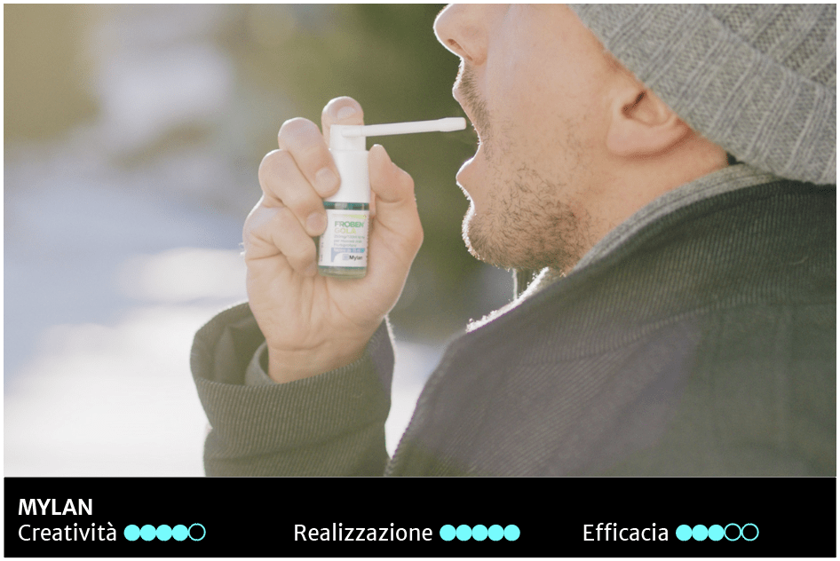 Iniziamo con Mylan che promuove Froben Gola spingendo la creatività con la creazione di una situazione surreale. In montagna, in pieno inverno, presenta delle situazioni estive alle quali il protagonista ammalato non riesce a partecipare. La soluzione starà nell’utilizzo del prodotto, che permetterà di godere appieno delle attività ricreative. Ottima la scelta di girare lo spot su vera neve in montagna. Scelta difficile dal punto di vista produttivo per questioni legate alle poche ore di luce disponibili e al freddo ma che ben ripaga in termini di veridicità e qualità del prodotto finito. La distonia tra panorama, abbigliamento, accessori e musica cattura l’interesse dello spettatore dall’inizio alla fine della narrazione.