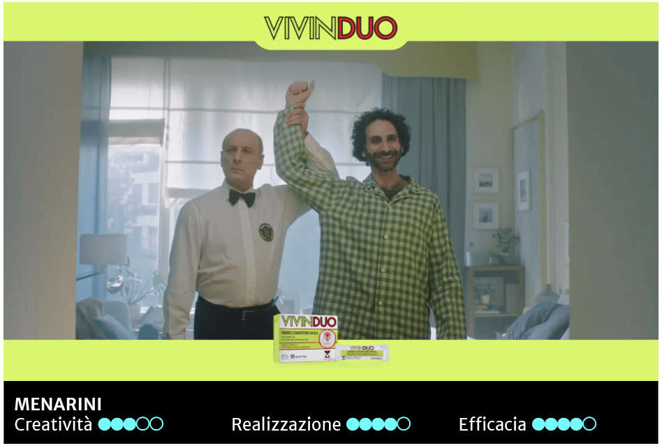 Menarini con Vivinduo sceglie una strada molto diversa. Associa all’influenza il luogo comune del pugile ko. L’originalità sta nella rappresentazione guidata dall’arbitro di box che conta accanto al malato per poi, dopo l’effetto del farmaco, celebrarne la vittoria. Come spesso accade nelle pubblicità sono i dettagli a fare la differenza e, in questo caso, la differenza la fa il piccolo gesto da pugile del protagonista mentre non è visto dalla partner, oltre a divertire aggiunge un senso di complicità e vicinanza che favorisce il brand promosso. Al netto dell’omino blu due belle pubblicità.