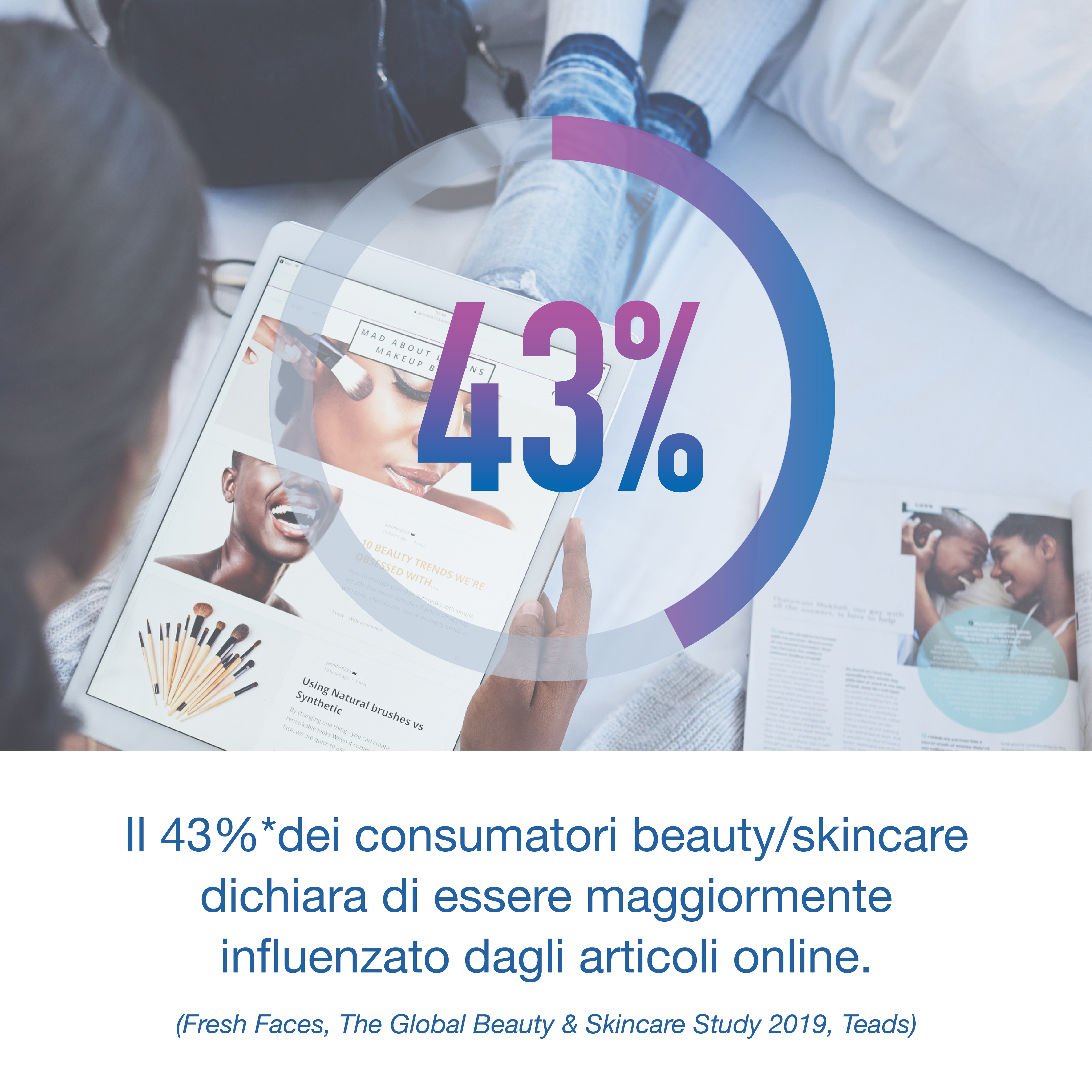 Il 43%* dei consumatori beauty/skincare dichiara di essere maggiormente influenzato dagli articoli online (o dal contenuto editoriale stesso o dalla pubblicità all’interno degli articoli) nel loro percorso di scoperta o acquisto di nuovi prodotti.