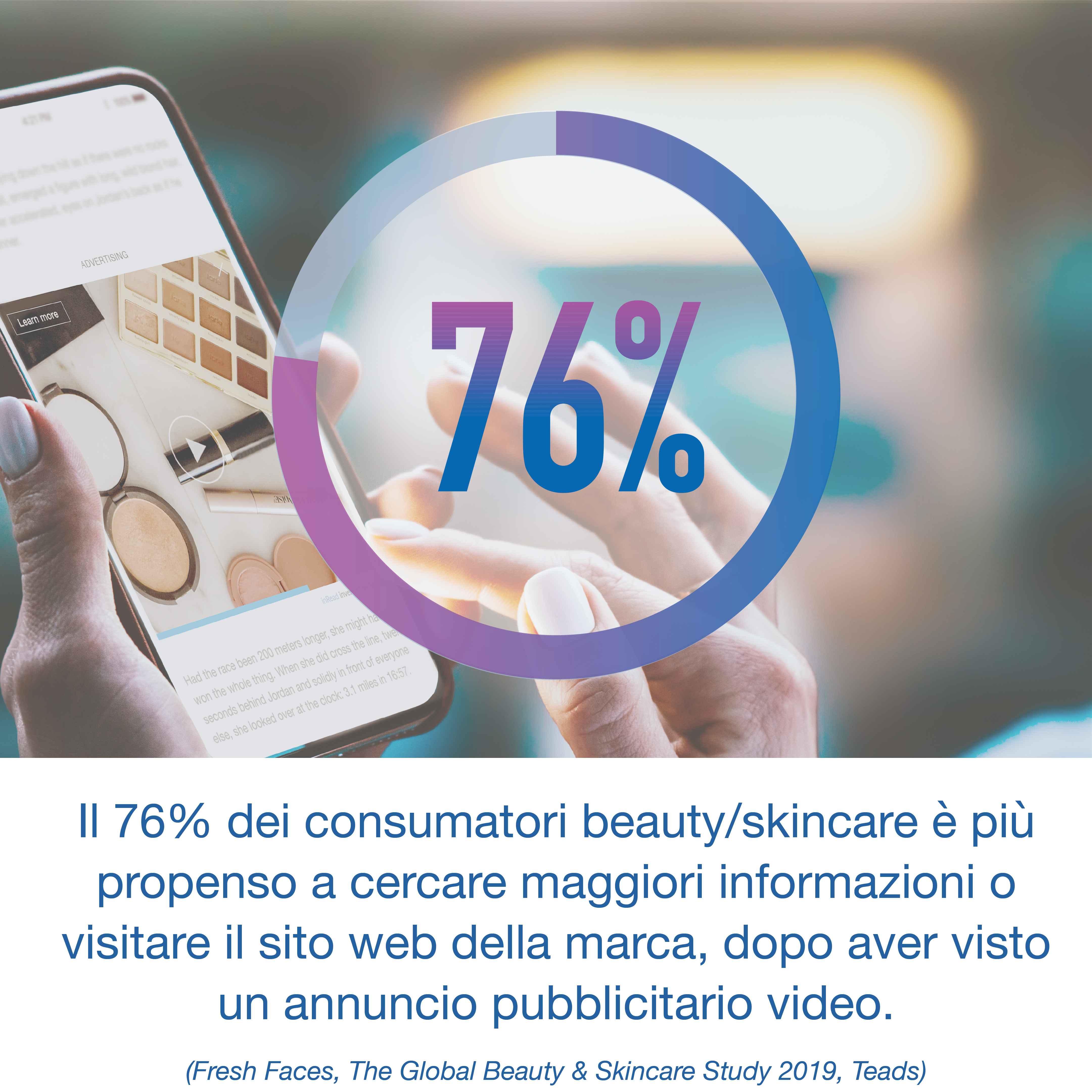 Il 76%* dei consumatori beauty/skincare dichiara di essere più propenso a effettuare un’azione come cercare maggiori informazioni o visitare il sito web della marca, dopo aver visto un annuncio pubblicitario video.