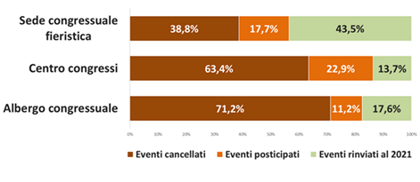 Negli alberghi congressuali in media il 71,2% degli eventi è stato definitivamente cancellato, l’11,2% posticipato e il 17,6% rinviato al 2021; nei centri congressi il 63,4% di tali eventi risulta cancellato, il 22,9% posticipato e il restante 13,7% rinviato all’anno successivo; nelle sedi congressuali fieristiche il 43,5% degli eventi risulta rinviato al 2021, il 38,8% è stato definitivamente cancellato e il 17,7% posticipato a una data successiva sempre del 2020.