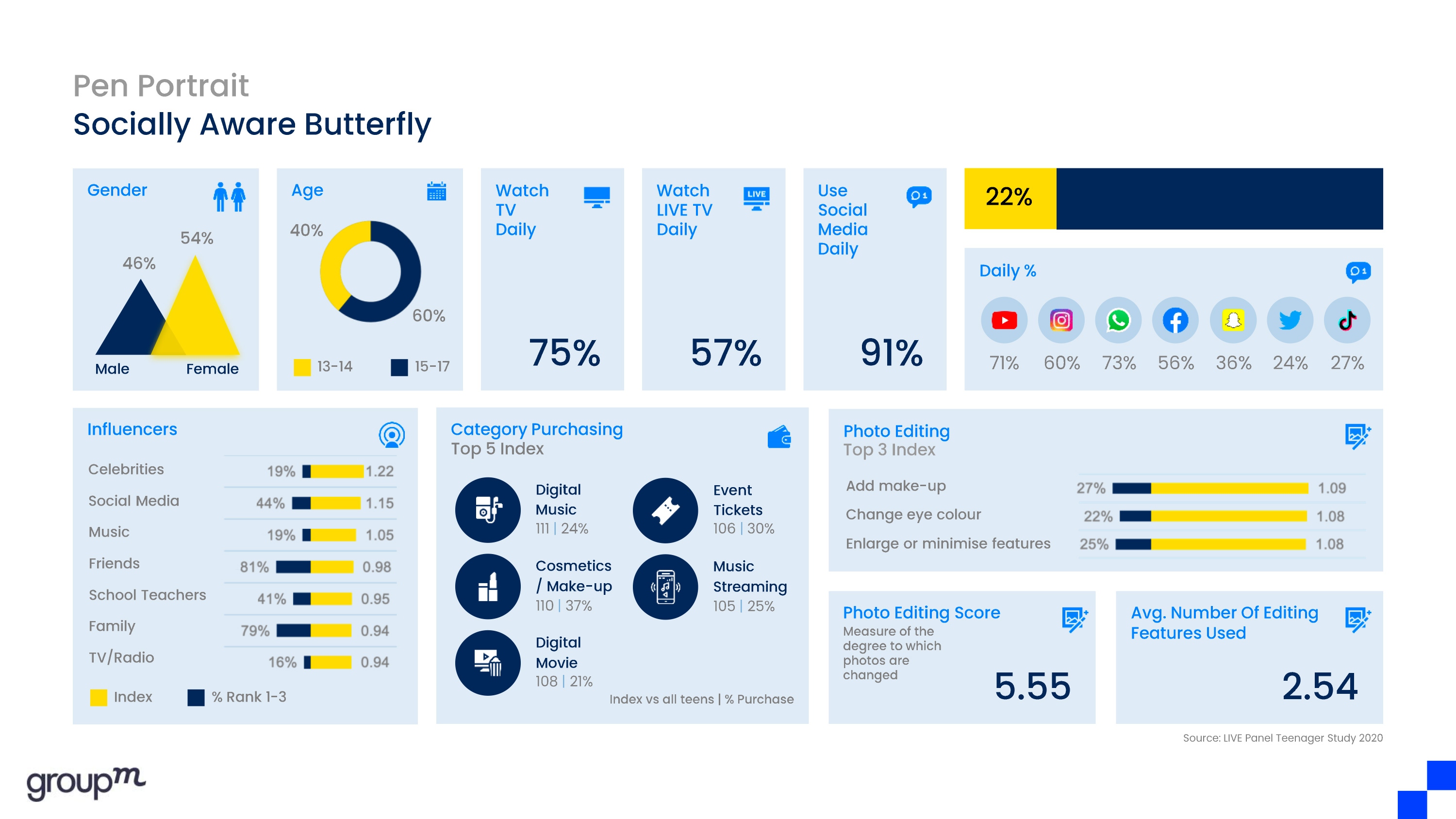 GroupM ha utilizzato LIVE Panel – il panel di consumatori online proprietario che alimenta il Data Hub di GroupM, ricco di numerose fonti dato integrate, cuore dello strumento proprietario per il Consumer Understanding e Media Activation & Optimization on e offline – intercettando le opinioni di circa 9.000 adolescenti tra 13 e 17 anni, reclutati tramite i genitori e intervistati con il loro consenso.
