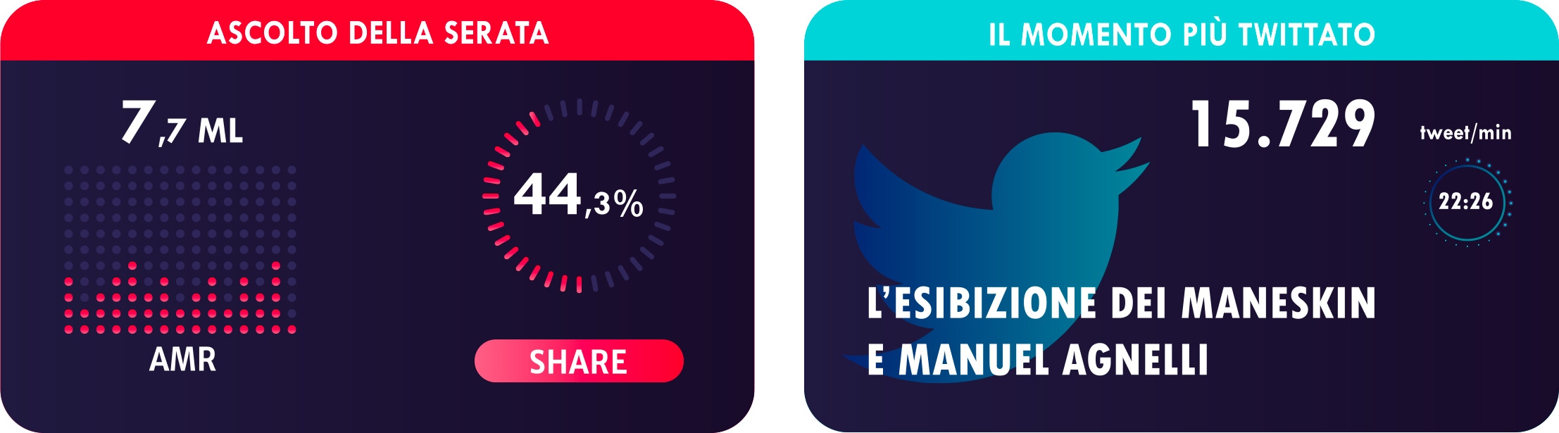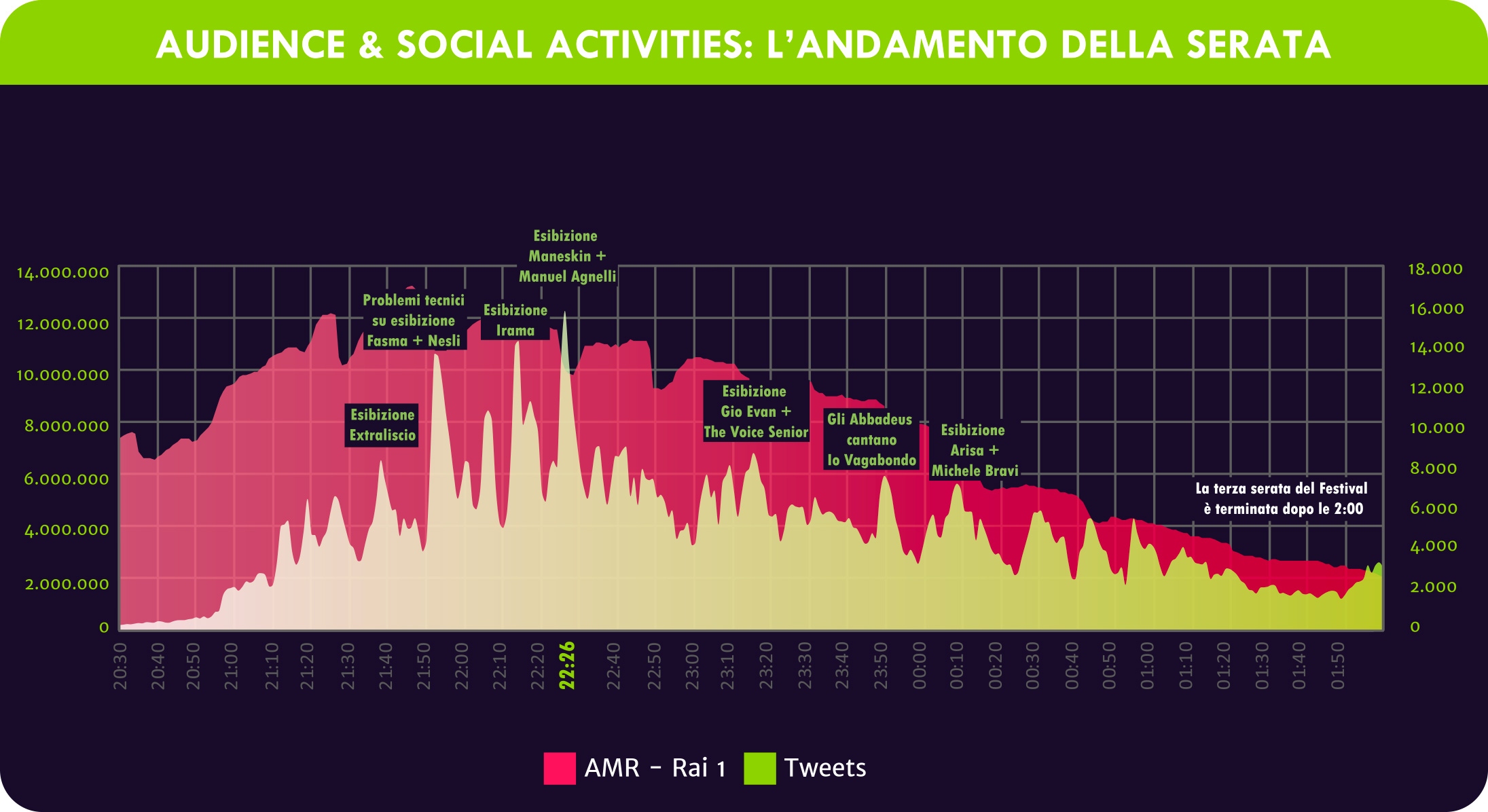 Sui social, alto engagement per l’esibizione dei Måneskin accompagnati da Manuel Agnelli, che raggiungono un picco di 15.729 interazioni al minuto (22:26).