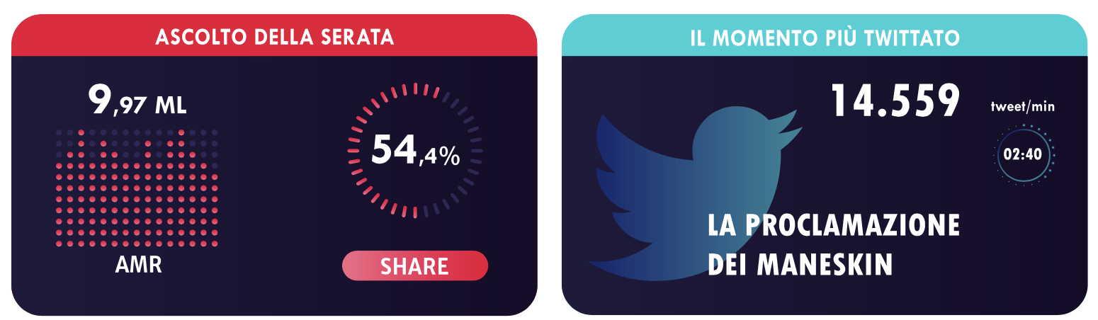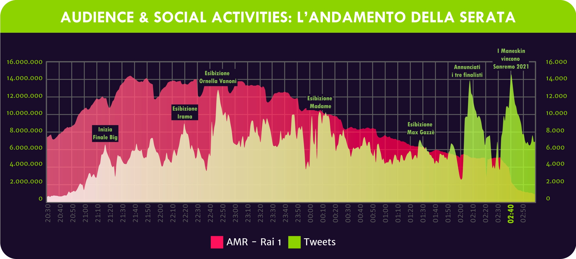 Una lunga serata, conclusasi alle 2:39: vincono i Måneskin, grazie al forte contributo del Televoto. La proclamazione dei Måneskin, con 14.559 tweet al minuto, è stato anche il momento più twittato della serata (2:40).