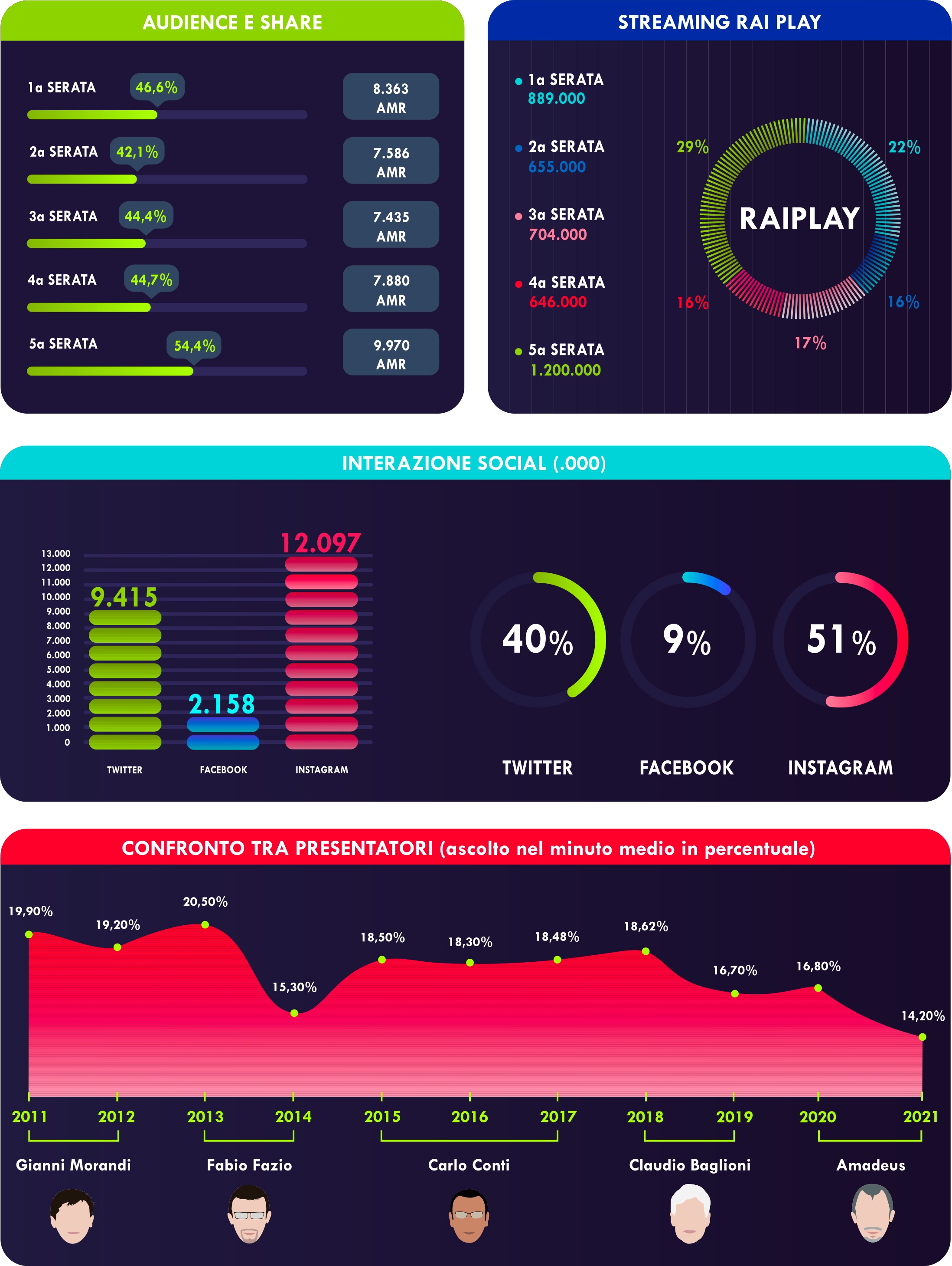 Un’edizione, la seconda targata Amadeus e Fiorello, che passerà alla storia come la prima edizione senza pubblico. Con una partenza in sofferenza, ma che è riuscita a risalire verso la finale, e con un forte coinvolgimento del pubblico, sui social e con il Televoto, confermato anche dal podio: trionfano i Måneskin, seguiti da Michielin-Fedez e medaglia di bronzo a Ermal Meta.