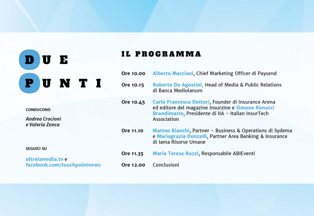 Su OltreLaMedia.tv fa il suo esordio Due Punti, il nuovo videomagazine di approfondimento verticale di Touchpoint. Il primo appuntamento con il format sarà dedicato al mondo delle Banche e delle Assicurazioni.