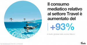 I segni della ripresa sono evidenti anche e soprattutto a livello media. Grazie alle partnership con i più prestigiosi editori in tutto il mondo e raggiungendo 1,9 miliardi di utenti, Teads ha un accesso diretto a una conoscenza profonda dei trend e comportamenti di fruizione dei consumatori online. Da un recente studio interno sulla media consumption che abbiamo condotto sulla piattaforma di Teads è emerso che il consumo mediatico a livello globale relativo al settore Travel è aumentato del +93% YoY*. L’Europa guida questo entusiasmo per la ripresa del settore con una crescita della dieta mediatica della sua digital population sui contenuti relativi ai viaggi del +41% rispetto al marzo 2020, dato destinato a crescere ancora di molto man mano che ci si avvicina alla nuova normalità. Si tratta di un dato più che incoraggiante per i brand di questo comparto che godono di un traffico sempre più intenso e un incremento dell’interesse rispetto alla possibilità di viaggiare. Negli Stati Uniti è il 70% dei Teads readers a dichiarare di essere fiducioso a proposito del tornare a viaggiare**. Al contrario i mercati UAE, LATAM e APAC sembrano ancora reticenti all’idea di spostarsi. Nel mercato europeo la situazione è molto simile a quella US con tassi alti di risposte a favore di pianificazione di viaggi di piacere o di business, anche all’estero (31% dei rispondenti francesi)**.