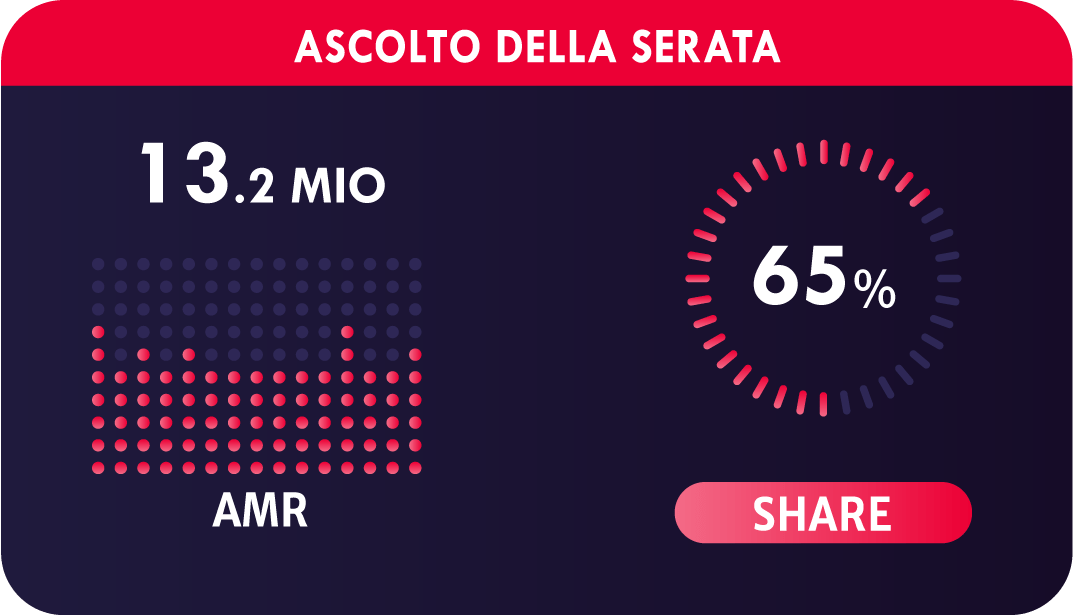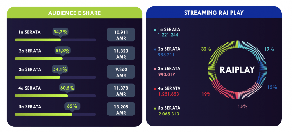 Una crescita del 32,4% rispetto alla finale del 2021 con i suoi 9.97 milioni di telespettatori e 54,4% di share. Superati anche i risultati del 2020, quando la finale catturò 10.9 milioni di italiani con un 61,7% di share.