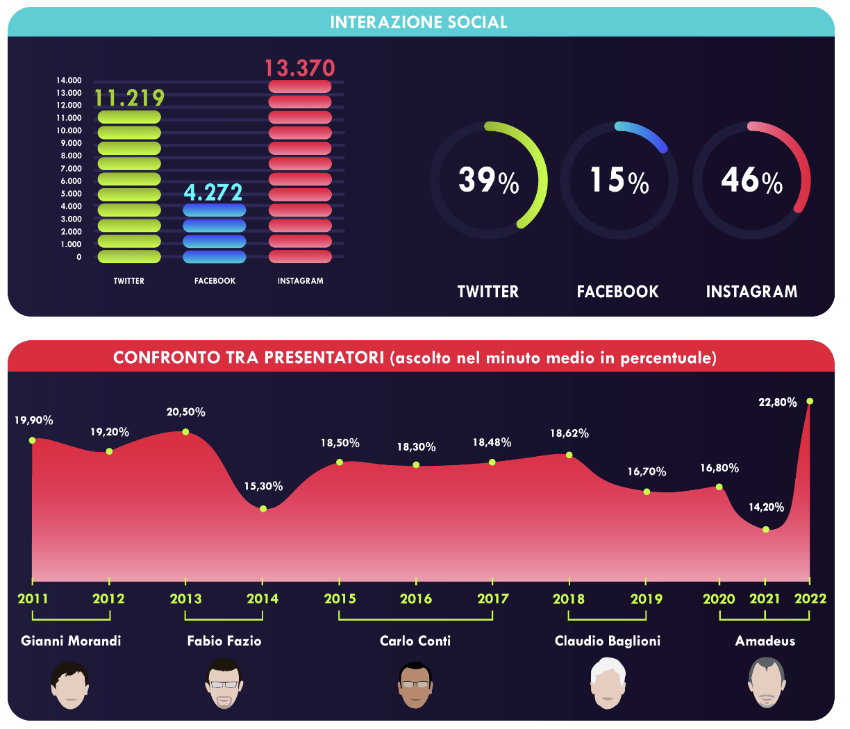7.7 milioni di interazioni sui social per la finale. Tra Twitter, Instagram e Facebook, il Festival ha ottenuto 29 milioni di interazioni: un +22% rispetto alla scorsa edizione.