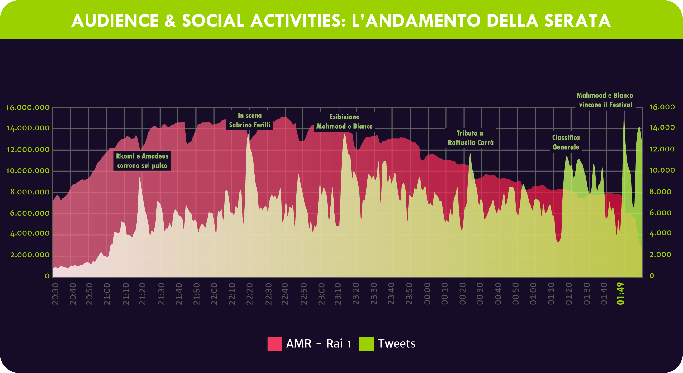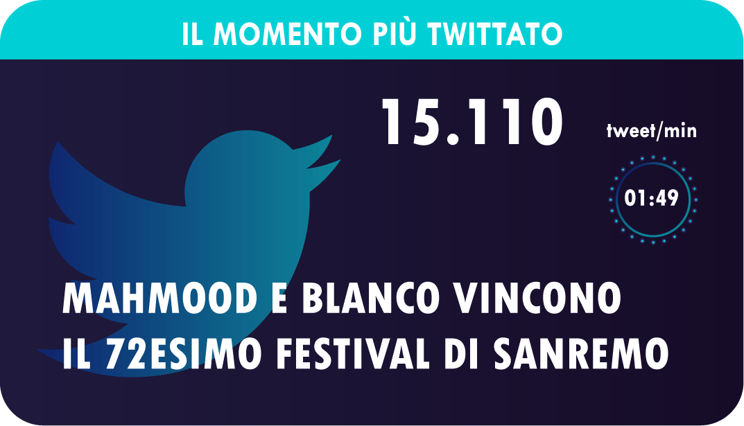 Il picco della serata in termini di share è stato raggiunto durante la proclamazione dei vincitori Mahmood e Blanco con “Brividi”, seguita dall’81,15% del pubblico televisivo all’1:47. L’annuncio della vittoria è stato anche il momento più twittato, con 15.110 tweet al minuto (1:49).