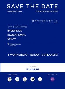 Si terrà domani 2022 presso la Triennale di Milano, il primo educational show immersivo ideato da Dario Spallone, giovane CEO del brand D1 Milano, nato in collaborazione con Bocconi For Innovation, Istituto Marangoni, Università Ca’ Foscari Venezia (Dipartimento di Management) e con il patrocinio del Comune di Milano. Media Partner dell’evento è Aroundtable TV, supportato dalconduttore della serata Angelo Ruggeri. I’MPROVE THE FUTURE è un format unico nel suo genere che coinvolgerà gli studenti in una giornata di condivisione di pensieri ed esperienze su valori e tematiche legate al futuro. Saranno loro stessi i protagonisti di questo evento dedicato all’educazione, con focus su passione, dedizione,impegno, contenuti, percorso professionale e proattività.