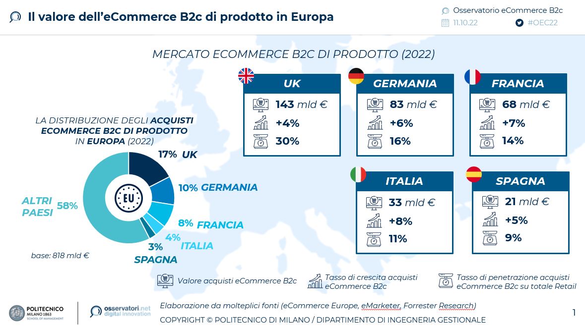 Nel 2022 l’e-commerce di prodotto continua la propria corsa, pur con un ritmo più contenuto (+8%) rispetto a quanto visto nel 2021 (+18% sul 2020), e tocca i 33,2 miliardi di euro. Gli acquisti online di servizi, invece, portano a termine il proprio percorso di ripresa (+59%) e raggiungono quota 14,9 miliardi di euro. Queste alcune delle evidenze presentate dall’Osservatorio eCommerce B2c, giunto alla ventiduesima edizione, durante il convegno promosso dalla School of Management del Politecnico di Milano e da Netcomm intitolato “eCommerce B2c: verso una crescita sostenibile?”.