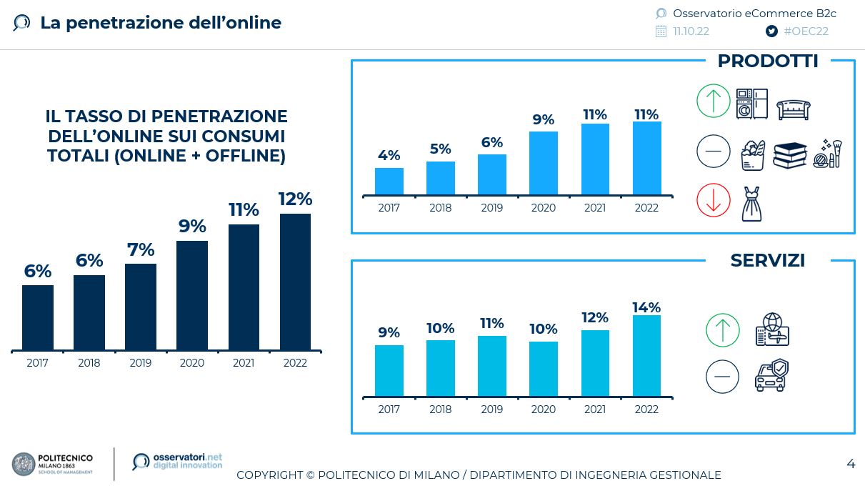 Rallenta l’e-commerce di prodotto (+8% nel 2022, rispetto al +18% nel 2021), mentre ritorna ai livelli del pre-pandemia quello di servizi grazie a una crescita del +59%