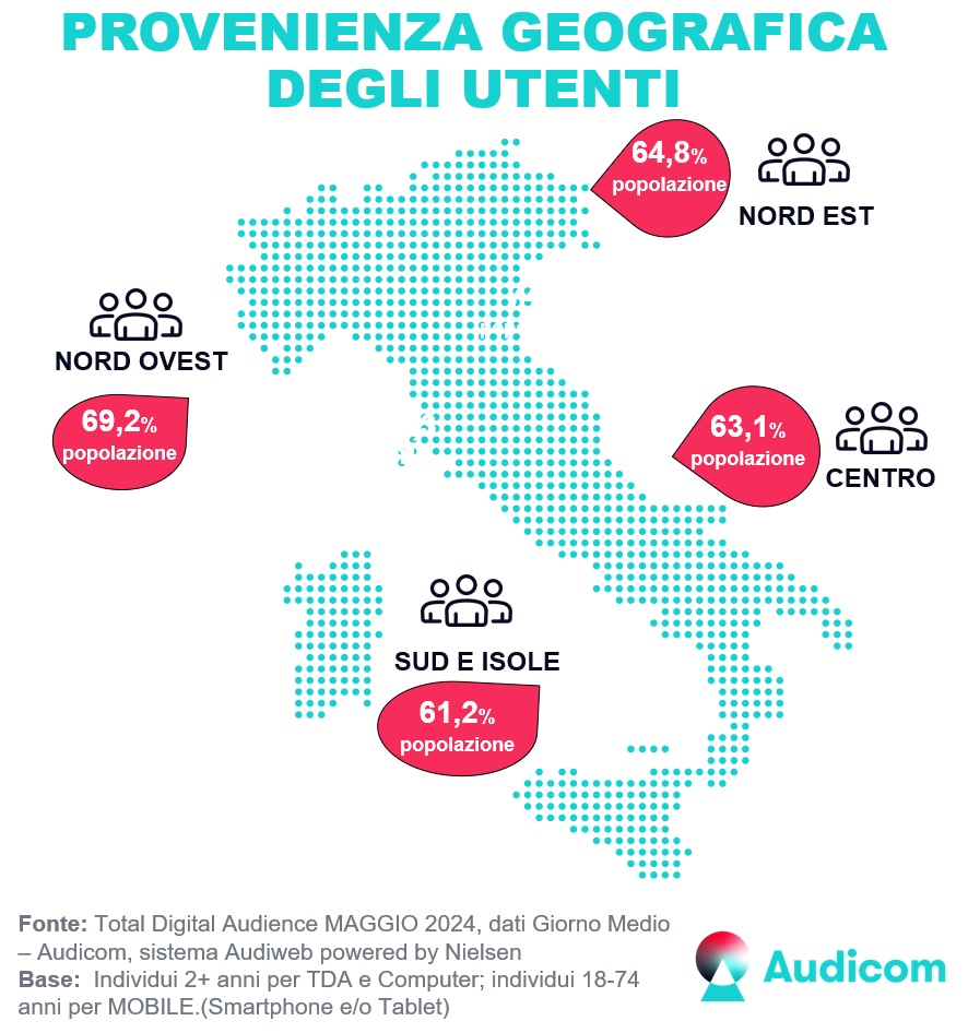 La total digital audience nel mese di maggio 2024 ha raggiunto 44,9 milioni di individui, pari al 76,8% della popolazione dai 2 anni in su, collegati da Mobile (Smartphone e/o Tablet) e Computer complessivamente per 74 ore. I dati, prodotti dal sistema Audiweb e distribuiti da Audicom, evidenziano che in questo mese ha navigato da Computer il 48,6% degli individui di 2+ anni, il 3,3% in più rispetto ad aprile, mese segnato da alcune pause festive che hanno contratto la fruizione da questo dispositivo. Nel giorno medio sono stati 37,6 milioni gli individui che hanno navigato almeno una volta dai dispositivi rilevati (il 64,4% della popolazione dai 2 anni in su), online per 2 ore e 51 minuti in media per persona.