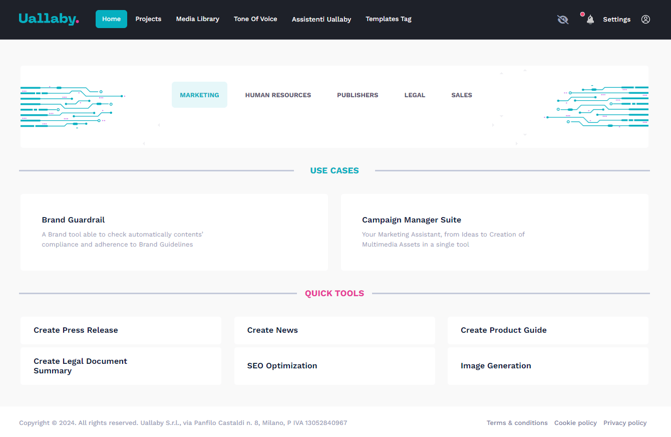 La piattaforma Uallaby permette alle organizzazioni, nelle loro varie funzioni, dal Marketing ai team Editoriali, dal Legal alle Risorse Umane, di importare e gestire contenuti, informazioni, dati, line guida e policy permettendo loro, con un’ interfaccia semplice e altamente personalizzabile, di gestire task complessi grazie a un framework proprietario che, tramite l’ausilio delle varie soluzioni di Intelligenza Artificiale Generativa presenti sul mercato, restituisce all’utente l’output finale desiderato.