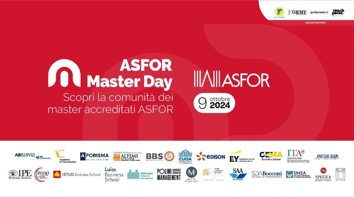 I media partner dell’ASFOR Master Day includono FormaFuturi, il magazine digitale di ASFOR dedicato alla formazione e cultura manageriale, insieme a GuidaMaster, Forme e Touchpoint.