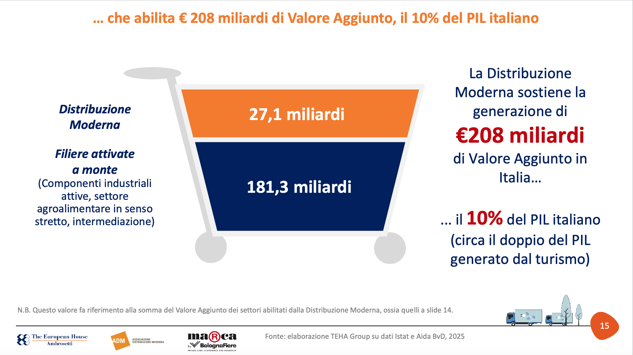 «La Distribuzione Moderna – ha commentato Valerio De Molli, Managing Partner e CEO di TEHA – genera in Italia 208 miliardi di euro di valore aggiunto, il 10% del PIL tra il valore diretto (oltre 27 miliardi) e la filiera indiretta (181 miliardi). Un settore chiave che da anni coniuga la sostenibilità nella sua accezione più ampia alla crescita ascoltando le esigenze del mercato: secondo una nostra ricerca recente tre quarti degli italiani intervistati sono stati disposti a spendere fino al 20% in più per un prodotto sostenibile».
