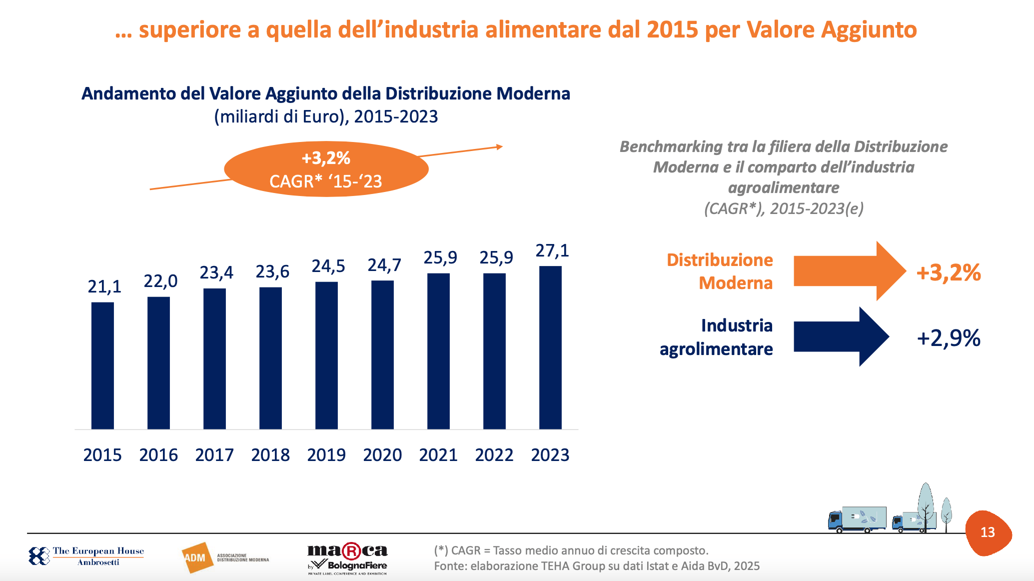 Secondo l’analisi TEHA per ADM le aziende il cui giro d’affari deriva per oltre l’80% dai prodotti a marchio del distributore, tra 2015 e 2023, hanno avuto un incremento medio annuo di fatturato dell’8,5%, meglio della media dell’industria alimentare (+3,9%).