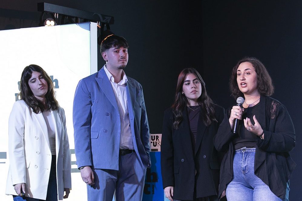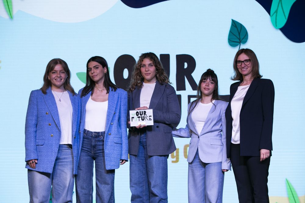 I vincitori dell’edizione 2025 di Our Future e della categoria “Creatività”- CLIQUE. Da sinistra: Chiara Graziano, Rachele Fermarelli, Sheila Zanchi di Amundi, Amedeo Gambacorti e Ilaria Cintura