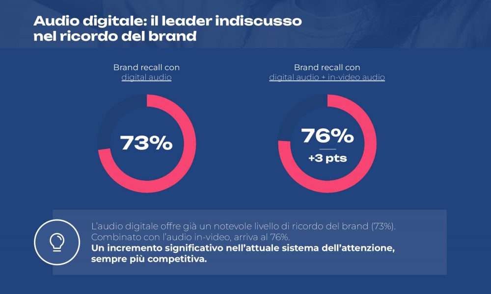 Questa convergenza crea opportunità inedite per i brand in cerca di performance e rilevanza, come dimostrano i principali risultati dello studio: 73% di ricordo del brand con il solo audio digitale; +3 punti combinando audio digitale e in-video audio; +80% di memorizzazione corretta del messaggio con la combinazione dei due formati; +3 punti nella considerazione del brand (intenzione di acquisto o utilizzo) con l’approccio duale all’audio.