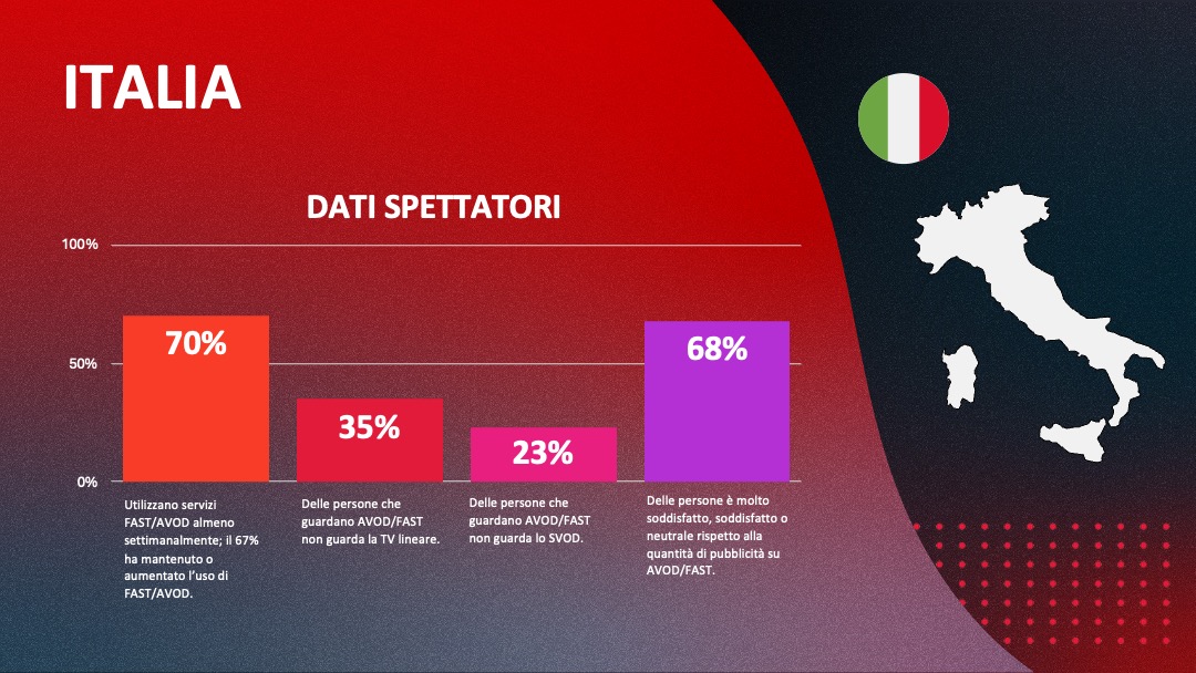 In Italia, i dati rivelano un cambiamento verso i modelli di streaming gratuiti finanziati dalla pubblicità, con il 70% degli intervistati che dichiara di guardare servizi AVOD (Video on Demand con pubblicità) o FAST (TV gratuita con pubblicità) almeno una volta a settimana.