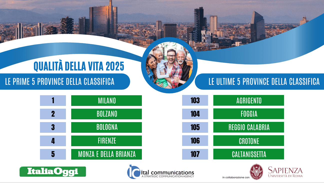 Ha aggiunto Attilio Lombardi, Founder di Ital Communications, afferma: «L’indagine che anche nel 2025 Ital Communications, insieme a ItaliaOggi e in collaborazione con l’Università Sapienza di Roma, ha condotto su 107 province italiane, analizzando dimensioni quali lavoro, sicurezza sociale, ambiente, istruzione, giustizia, salute, ha permesso di avere un quadro ampio e dettagliato sul livello di qualità della vita. Sono emersi segnali importanti, utili per valutare criticità e urgenze, ma anche aspetti positivi e di crescita. Il nostro impegno e il nostro ruolo, come comunicatori, è quello di favorire la buona comunicazione, che rappresenta un elemento fondamentale per la capacità dei cittadini a partecipare alle decisioni collettive: si tratta di un modo per agevolare un dialogo concreto all’interno delle comunità, utile allo sviluppo dei singoli territori».