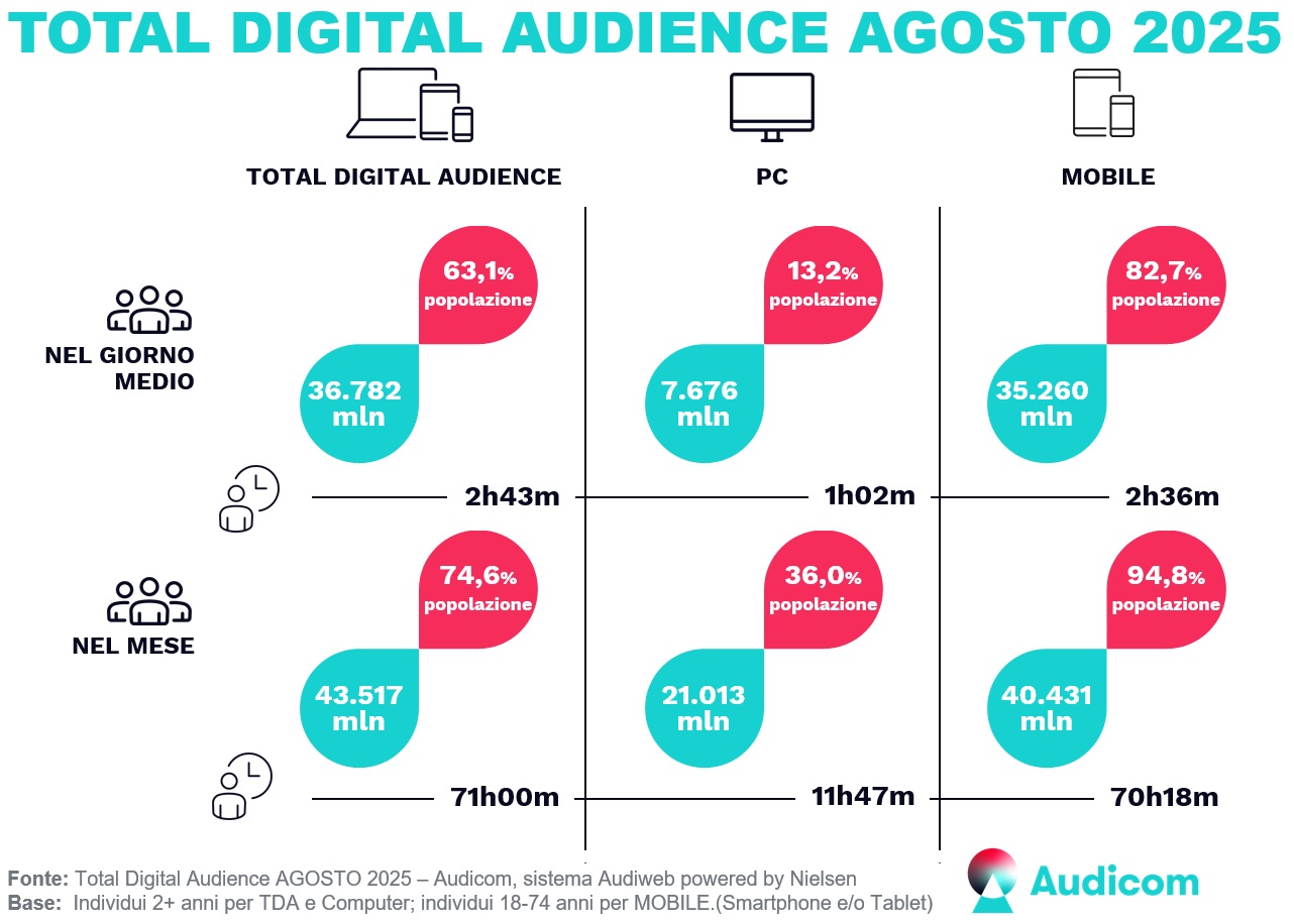 Nel mese di settembre la Total Digital Audience raggiunge 43,9 milioni di utenti, pari al 75,4% della popolazione 2-74 anni, collegati da smartphone, tablet e computer per un totale di quasi 70 ore di navigazione.