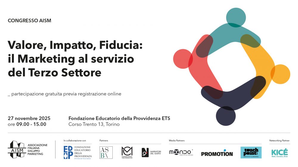 Si è svolto lo scorso 27 novembre a Torino presso l’Aula Magna della Fondazione Educatorio della Provvidenza ETS il Congresso Annuale di AISM – Associazione Italiana Sviluppo Marketing – “Valore, Impatto, Fiducia: il Marketing al servizio del Terzo Settore”, una giornata intensa, ricca di idee, visioni e spunti concreti che ha visto la presenza di oltre 130 partecipanti – tra professionisti, esperti e rappresentanti del settore – richiamati dal tema, dal prestigio dei relatori e dall’impostazione dell’evento che ha unito interventi di spessore a momenti di dialogo e condivisione.