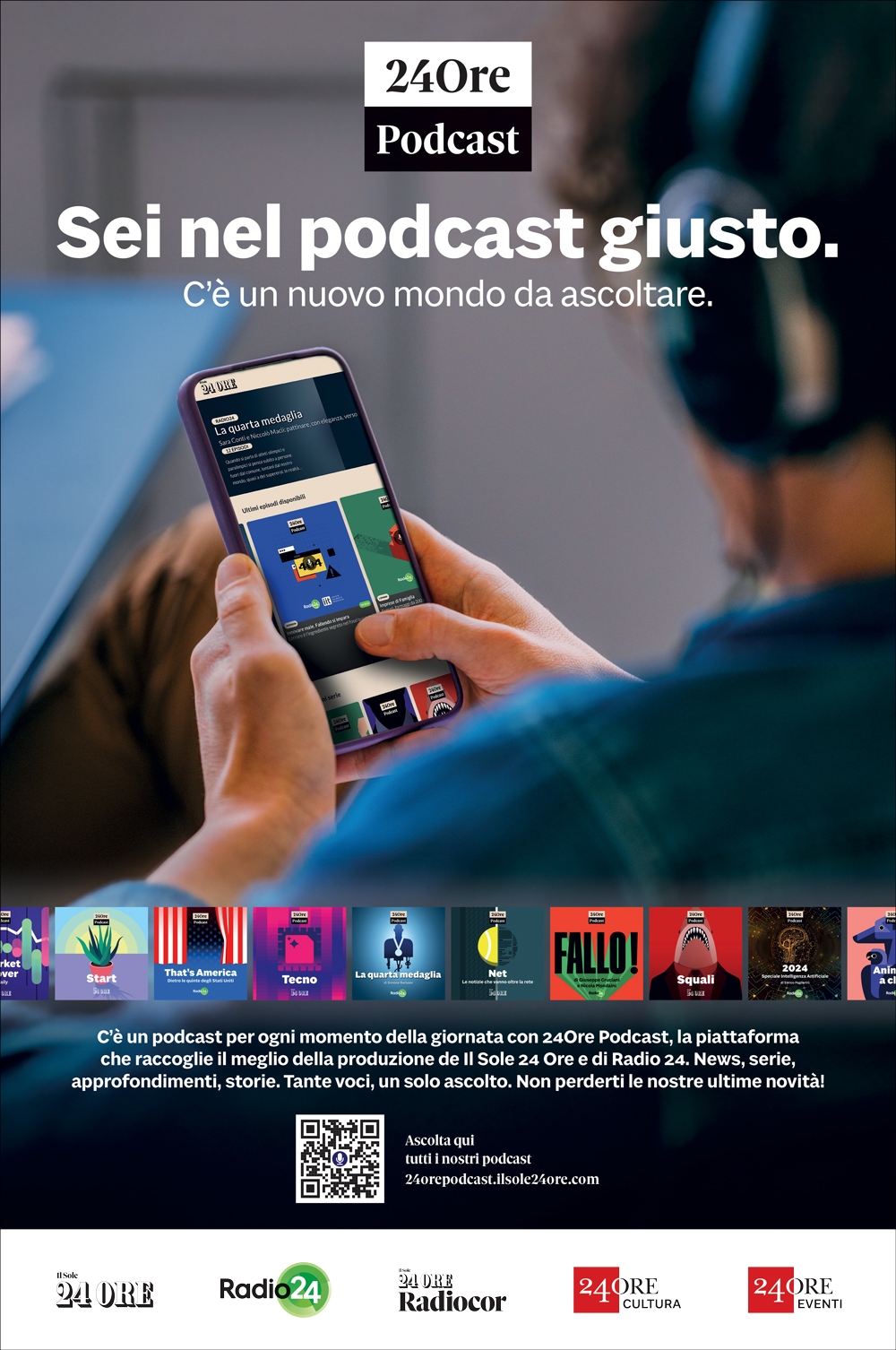 Da ieri il Gruppo 24 ORE ha inaugurato una nuova pagina web dedicata a tutti i podcast, un unico spazio digitale che raccoglie la produzione originale del Gruppo firmata 24Ore Podcast. Il sito 24orepodcast.com dà visibilità ai podcast originali del Sole 24 Ore, di Radio 24 e ai nuovi progetti realizzati in sinergia con le aree del Gruppo, a partire da 24 ORE Cultura, diventando il nuovo punto di accesso unificato a tutti i titoli presenti sulle piattaforme di Radio 24 e IlSole24Ore.com. La pagina propone rail tematiche, organizzate per raggruppamenti che spaziano dall’economia alla tecnologia, dalla politica alle storie di vita, dalla cultura al true crime, dando visibilità alla grande varietà di contenuti proposti con un’esperienza di navigazione intuitiva e completa.