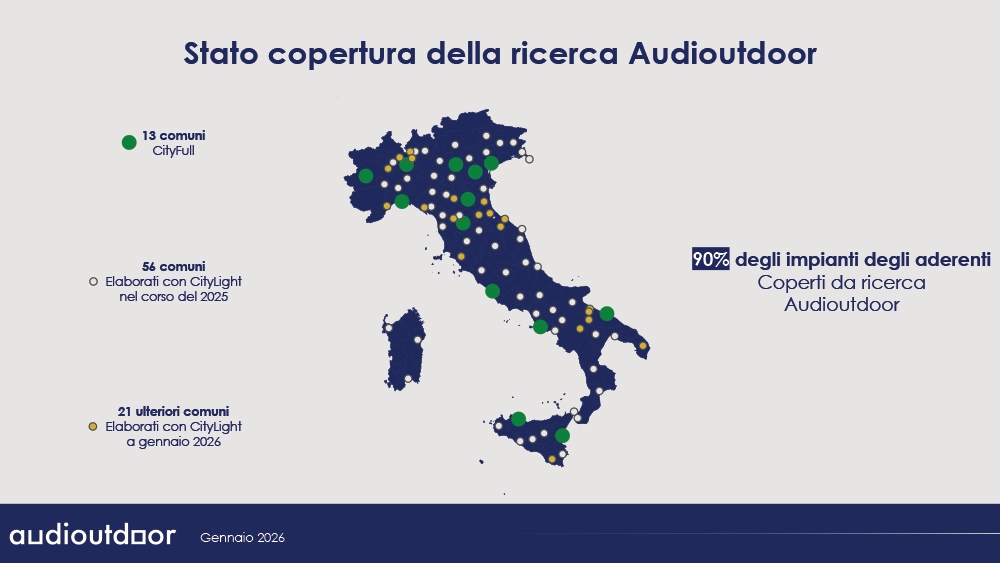 Con questa copertura territoriale Audioutdoor arriva a fornire informazioni dettagliate (contatti lordi, copertura netta, reach %, frequenza di esposizione, tempo di esposizione) per oltre il 90% del patrimonio gestito dalle società aderenti.