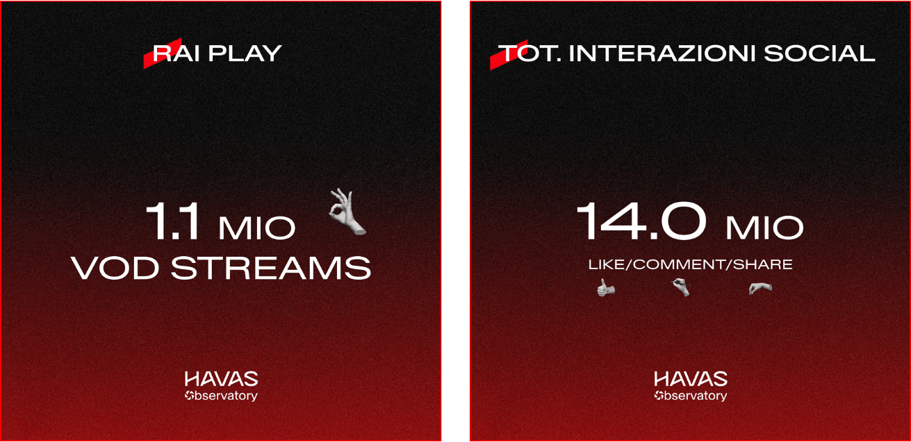 La vera energia del Festival si sviluppa sempre più attorno a ciò che accade fuori dall’Ariston. La prima serata ha registrato numeri da record sui social: 58,7 milioni di visualizzazioni video, il valore più alto di sempre dopo una serata d’esordio e in crescita del 12% rispetto allo scorso anno. Le interazioni totali hanno invece raggiunto quota 14 milioni. Cresce anche la fruizione on demand su RaiPlay con oltre un milione di views (+ 15% vs 2025).