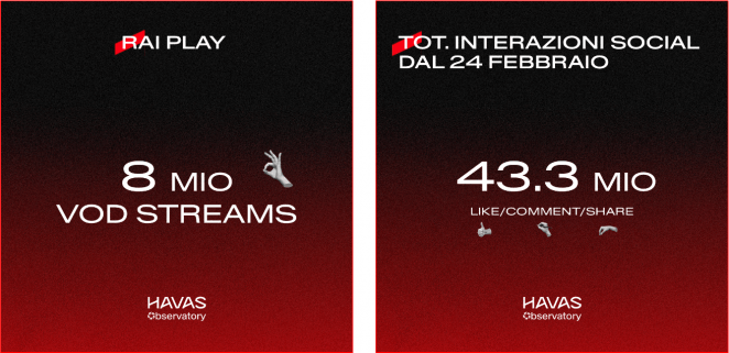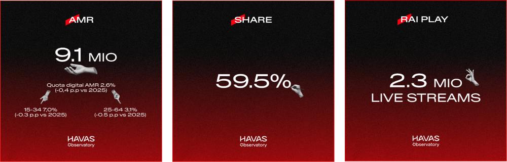 La quota digital della Total Audience si attesta al 2,6% e i Live Streams a 2,3 milioni, ma è nel consumo on demand che si registra la spinta più significativa del pubblico: le clip caricate su RaiPlay hanno generato 8 milioni di visualizzazioni.
