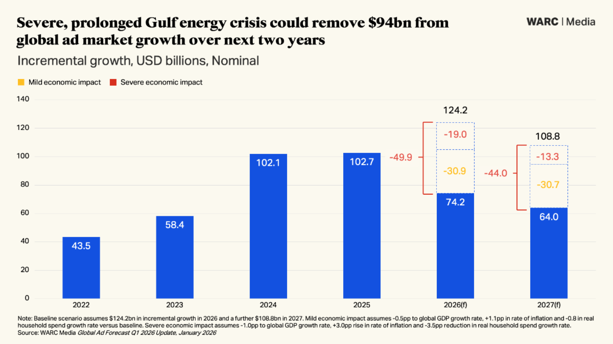 Secondo l’ultimo rapporto WARC sul mercato adv mondiale, aggiornato al primo trimestre 2026, il prolungarsi della crisi in Medio Oriente potrebbe sottrarre fino a 49,9 miliardi di dollari alla crescita degli investimenti pubblicitari nell’anno in corso, con un impatto complessivo che nei prossimi due anni potrebbe sfiorare i 94 miliardi.