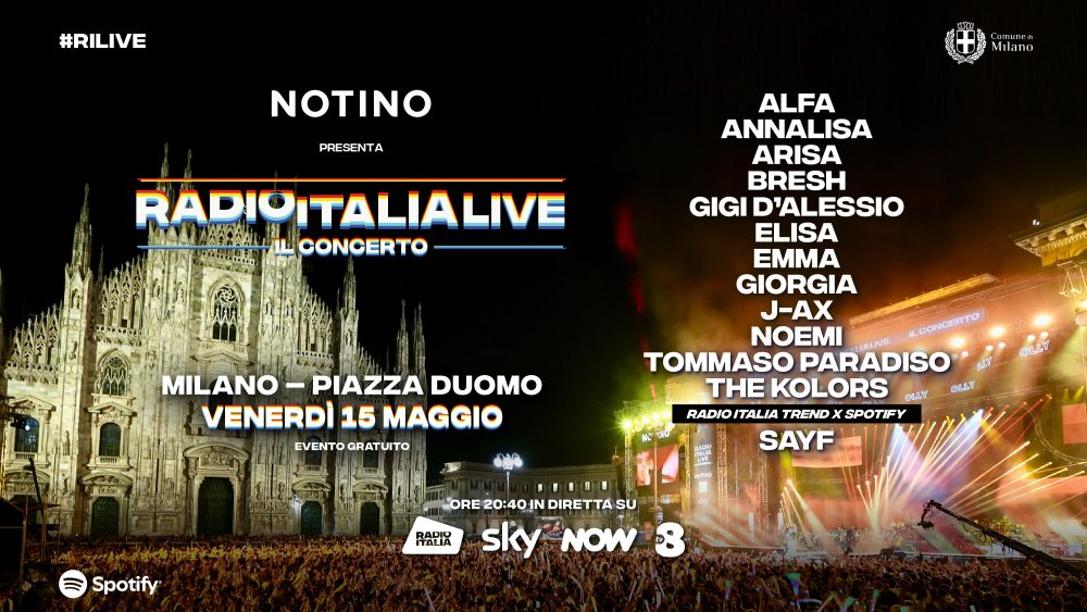 Appuntamento in Piazza Duomo a Milano venerdì 15 maggio per l’edizione 2026 di Radio Italia Live – Il Concerto: sul palco Alfa, Annalisa, Arisa, Bresh, Gigi D’Alessio, Elisa, Emma, Giorgia, J-Ax, Noemi, Tommaso Paradiso, The Kolors. Radio Italia Trend X Spotify: Sayf.